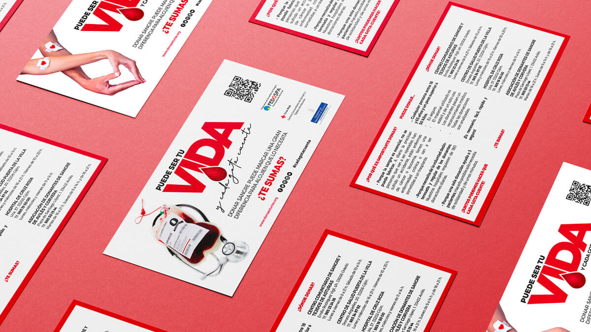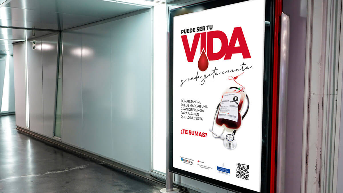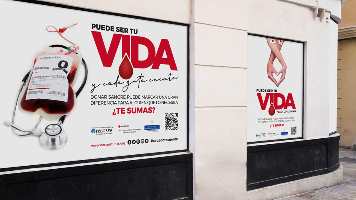 La campaña “Puede ser tu vida” fue diseñada para Cruz Roja y FEDOSPA con el objetivo de fomentar la donación de sangre en Asturias. El concepto creativo se centra en un mensaje directo y emocional: cada gota cuenta. La imagen del eslogan combina la palabra “VIDA” con una gota de sangre integrada en la tipografía, reforzando visualmente el vínculo entre donar y salvar vidas.